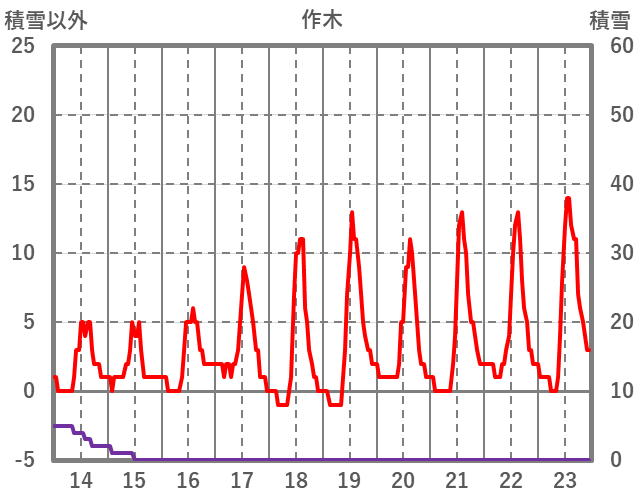 | 日 | 時 | 気温 | 降水 | 風向/風速 | 日照 | 積雪 | 降雪 |
