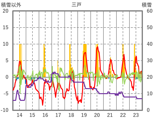 | 日 | 時 | 気温 | 降水 | 風向/風速 | 日照 | 積雪 | 降雪 |