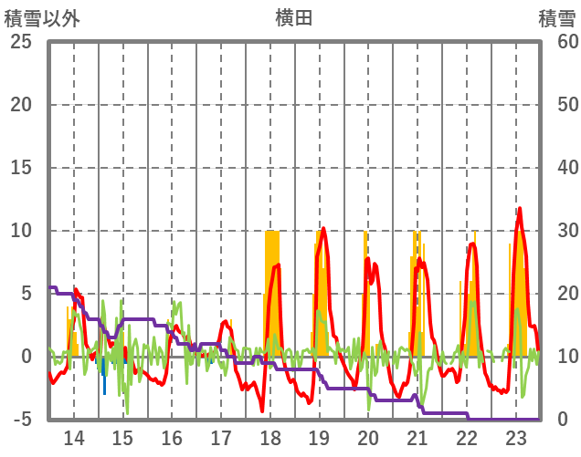 | 日 | 時 | 気温 | 降水 | 風向/風速 | 日照 | 積雪 | 降雪 |
