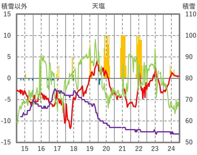 | 日 | 時 | 気温 | 降水 | 風向/風速 | 日照 | 積雪 | 降雪 |