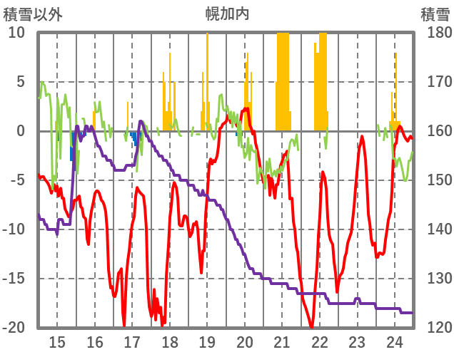 | 日 | 時 | 気温 | 降水 | 風向/風速 | 日照 | 積雪 | 降雪 |