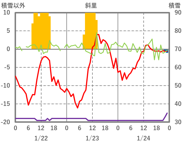 | 日 | 時 | 気温 | 降水 | 風向/風速 | 日照 | 積雪 | 降雪 |
