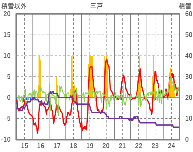 | 日 | 時 | 気温 | 降水 | 風向/風速 | 日照 | 積雪 | 降雪 |
