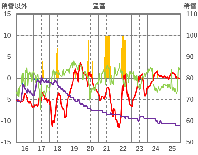 | 日 | 時 | 気温 | 降水 | 風向/風速 | 日照 | 積雪 | 降雪 |