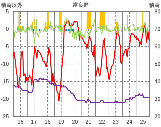 | 日 | 時 | 気温 | 降水 | 風向/風速 | 日照 | 積雪 | 降雪 |