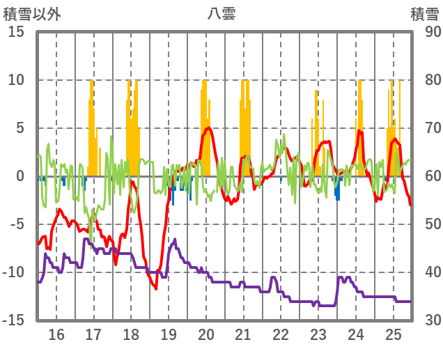 | 日 | 時 | 気温 | 降水 | 風向/風速 | 日照 | 積雪 | 降雪 |