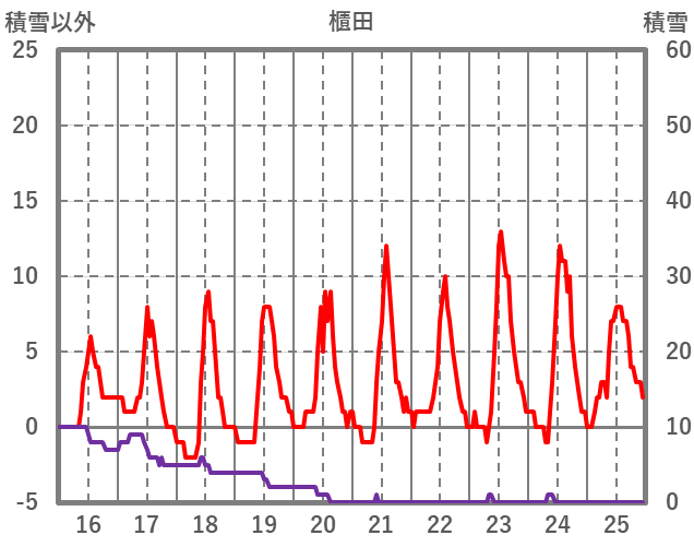 | 日 | 時 | 気温 | 降水 | 風向/風速 | 日照 | 積雪 | 降雪 |