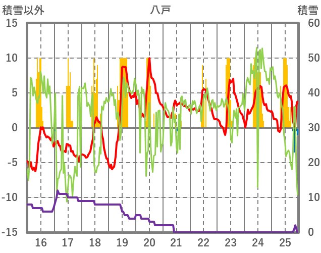 | 日 | 時 | 気温 | 降水 | 風向/風速 | 日照 | 積雪 | 降雪 |