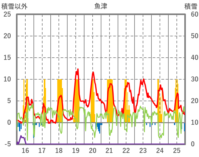 | 日 | 時 | 気温 | 降水 | 風向/風速 | 日照 | 積雪 | 降雪 |