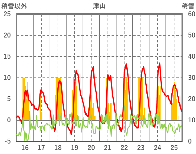 | 日 | 時 | 気温 | 降水 | 風向/風速 | 日照 | 積雪 | 降雪 |