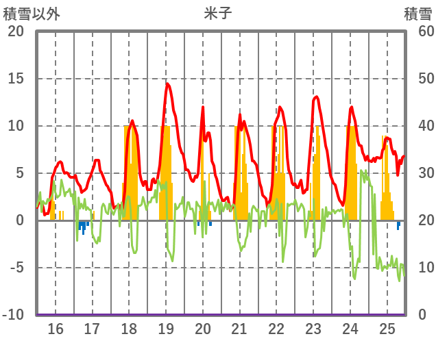| 日 | 時 | 気温 | 降水 | 風向/風速 | 日照 | 積雪 | 降雪 |