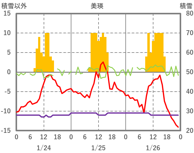 | 日 | 時 | 気温 | 降水 | 風向/風速 | 日照 | 積雪 | 降雪 |