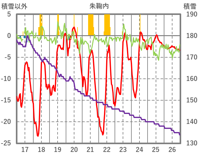 | 日 | 時 | 気温 | 降水 | 風向/風速 | 日照 | 積雪 | 降雪 |