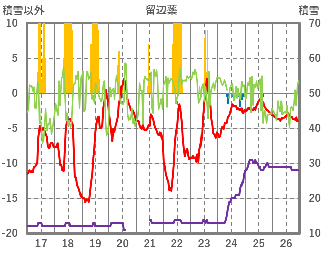 | 日 | 時 | 気温 | 降水 | 風向/風速 | 日照 | 積雪 | 降雪 |