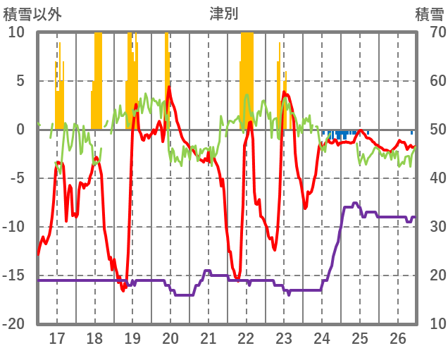 | 日 | 時 | 気温 | 降水 | 風向/風速 | 日照 | 積雪 | 降雪 |