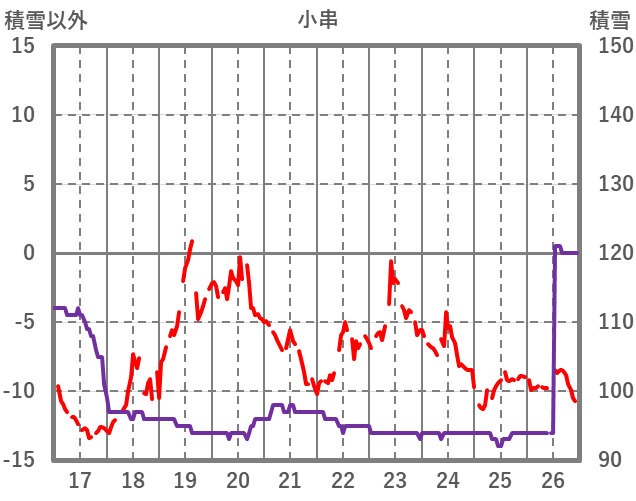| 日 | 時 | 気温 | 降水 | 風向/風速 | 日照 | 積雪 | 降雪 |