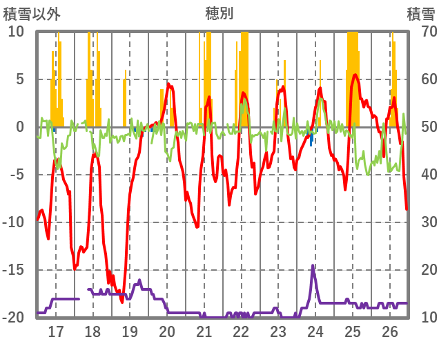 | 日 | 時 | 気温 | 降水 | 風向/風速 | 日照 | 積雪 | 降雪 |