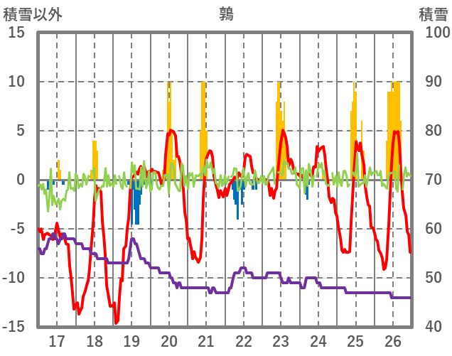 | 日 | 時 | 気温 | 降水 | 風向/風速 | 日照 | 積雪 | 降雪 |
