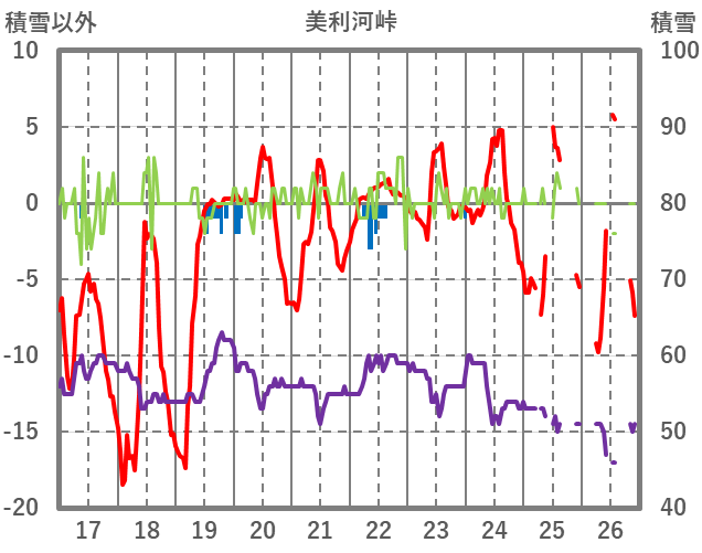 | 日 | 時 | 気温 | 降水 | 風向/風速 | 日照 | 積雪 | 降雪 |