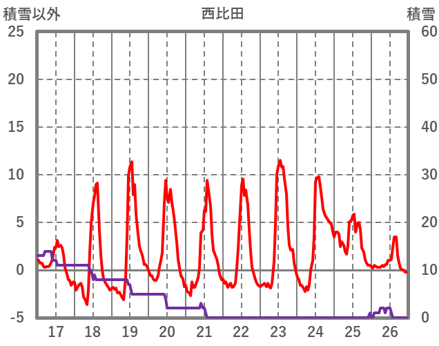 | 日 | 時 | 気温 | 降水 | 風向/風速 | 日照 | 積雪 | 降雪 |