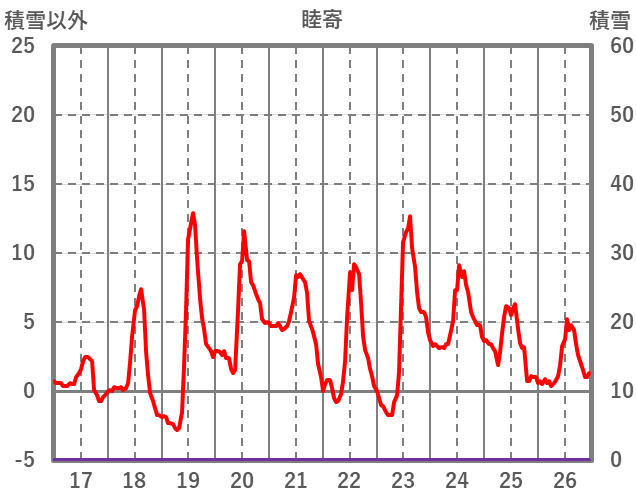 | 日 | 時 | 気温 | 降水 | 風向/風速 | 日照 | 積雪 | 降雪 |
