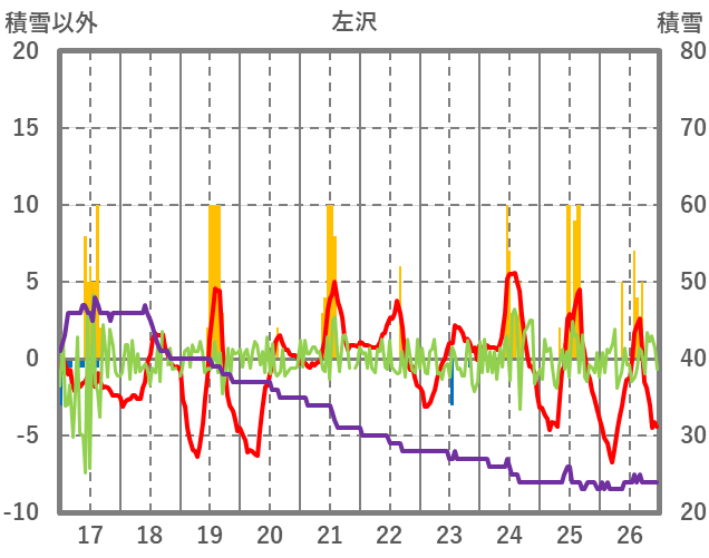 | 日 | 時 | 気温 | 降水 | 風向/風速 | 日照 | 積雪 | 降雪 |