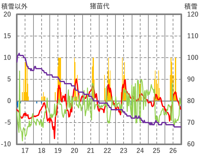 | 日 | 時 | 気温 | 降水 | 風向/風速 | 日照 | 積雪 | 降雪 |