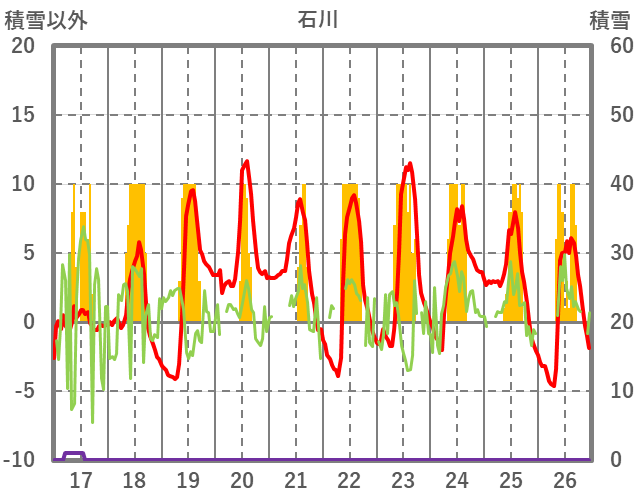 | 日 | 時 | 気温 | 降水 | 風向/風速 | 日照 | 積雪 | 降雪 |