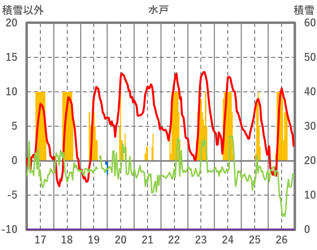 | 日 | 時 | 気温 | 降水 | 風向/風速 | 日照 | 積雪 | 降雪 |