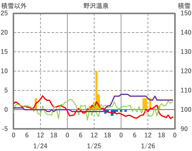 | 日 | 時 | 気温 | 降水 | 風向/風速 | 日照 | 積雪 | 降雪 |