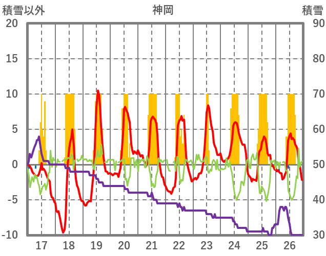 | 日 | 時 | 気温 | 降水 | 風向/風速 | 日照 | 積雪 | 降雪 |