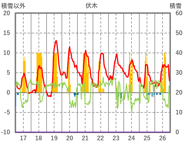 | 日 | 時 | 気温 | 降水 | 風向/風速 | 日照 | 積雪 | 降雪 |