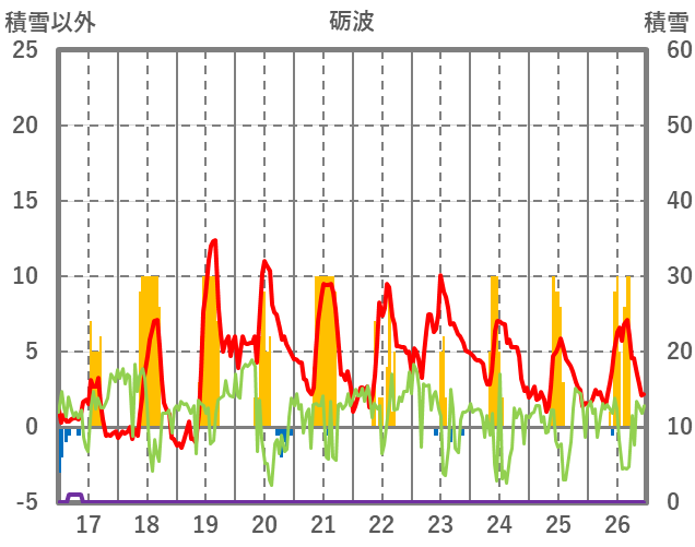 | 日 | 時 | 気温 | 降水 | 風向/風速 | 日照 | 積雪 | 降雪 |