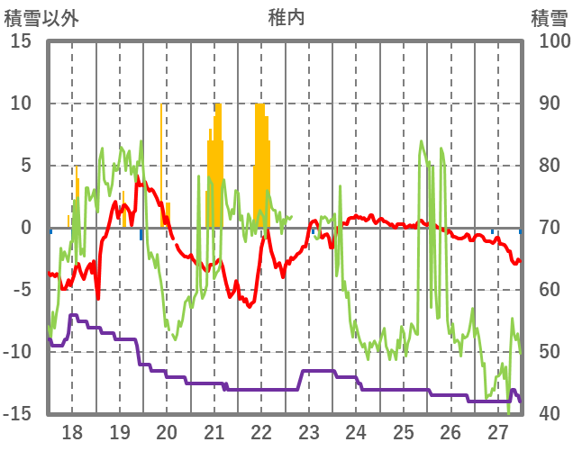 | 日 | 時 | 気温 | 降水 | 風向/風速 | 日照 | 積雪 | 降雪 |
