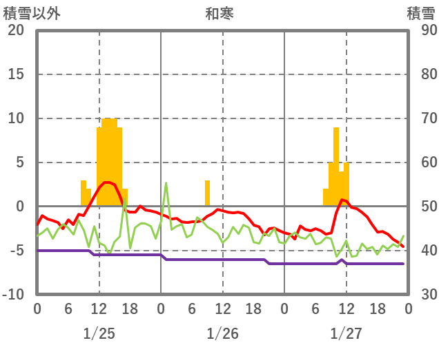 | 日 | 時 | 気温 | 降水 | 風向/風速 | 日照 | 積雪 | 降雪 |