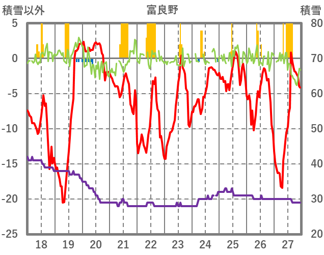 | 日 | 時 | 気温 | 降水 | 風向/風速 | 日照 | 積雪 | 降雪 |
