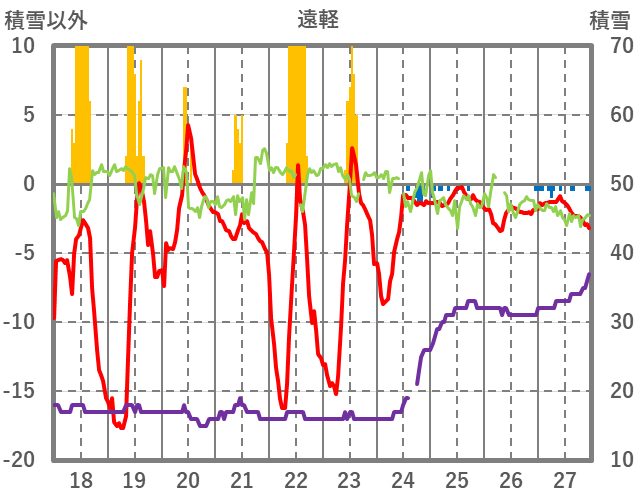 | 日 | 時 | 気温 | 降水 | 風向/風速 | 日照 | 積雪 | 降雪 |