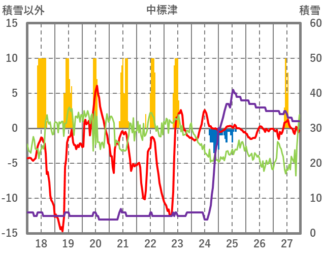 | 日 | 時 | 気温 | 降水 | 風向/風速 | 日照 | 積雪 | 降雪 |