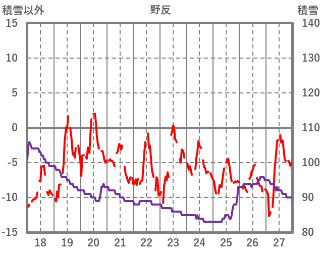 | 日 | 時 | 気温 | 降水 | 風向/風速 | 日照 | 積雪 | 降雪 |