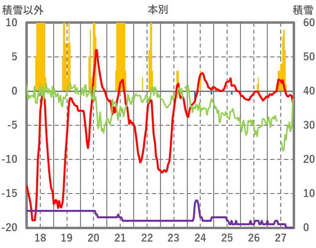 | 日 | 時 | 気温 | 降水 | 風向/風速 | 日照 | 積雪 | 降雪 |