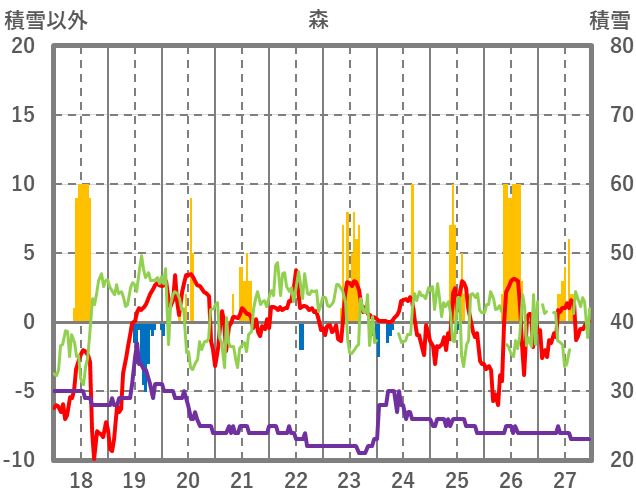 | 日 | 時 | 気温 | 降水 | 風向/風速 | 日照 | 積雪 | 降雪 |