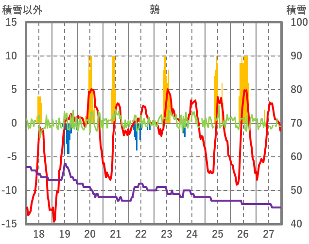 | 日 | 時 | 気温 | 降水 | 風向/風速 | 日照 | 積雪 | 降雪 |