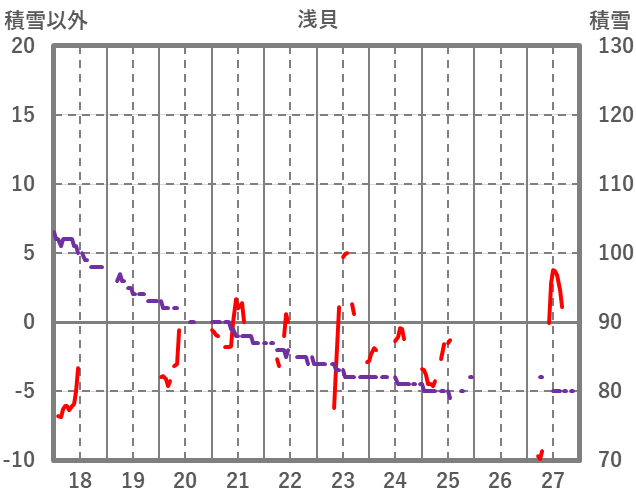 | 日 | 時 | 気温 | 降水 | 風向/風速 | 日照 | 積雪 | 降雪 |