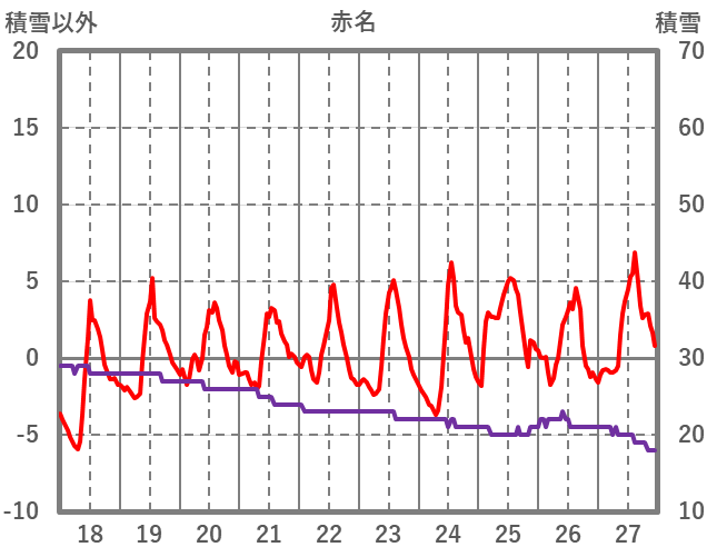 | 日 | 時 | 気温 | 降水 | 風向/風速 | 日照 | 積雪 | 降雪 |