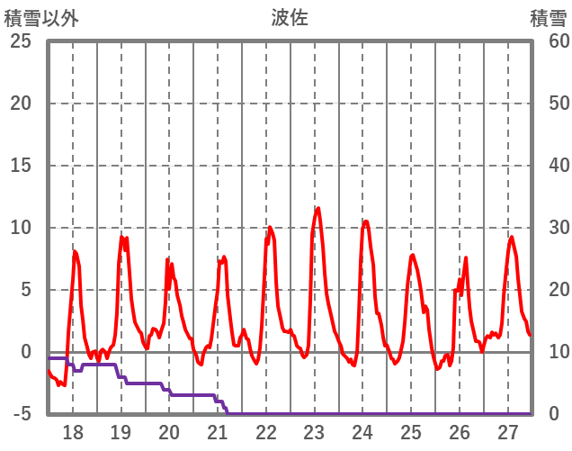 | 日 | 時 | 気温 | 降水 | 風向/風速 | 日照 | 積雪 | 降雪 |
