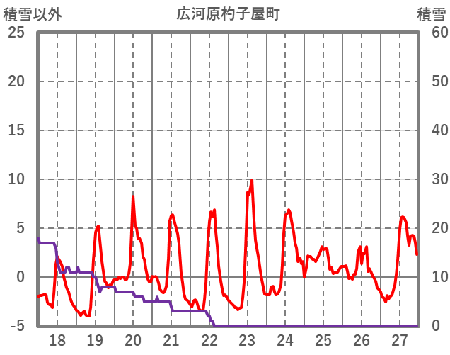 | 日 | 時 | 気温 | 降水 | 風向/風速 | 日照 | 積雪 | 降雪 |