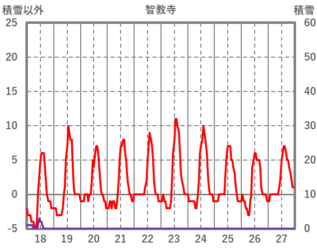 | 日 | 時 | 気温 | 降水 | 風向/風速 | 日照 | 積雪 | 降雪 |