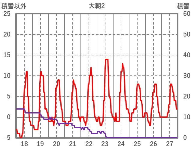 | 日 | 時 | 気温 | 降水 | 風向/風速 | 日照 | 積雪 | 降雪 |