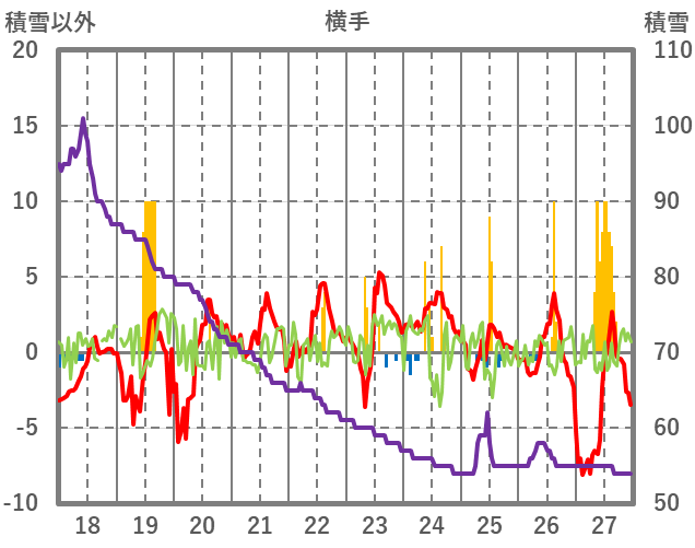 | 日 | 時 | 気温 | 降水 | 風向/風速 | 日照 | 積雪 | 降雪 |