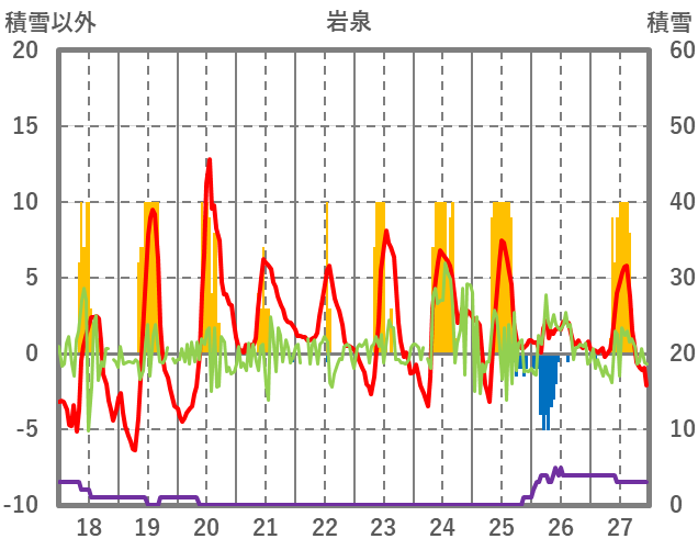 | 日 | 時 | 気温 | 降水 | 風向/風速 | 日照 | 積雪 | 降雪 |